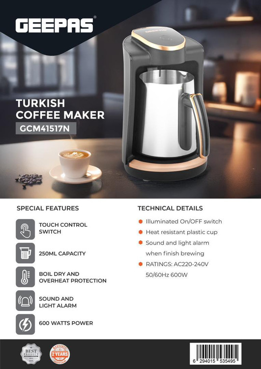 قهوهساز ترک جیپاس مدل GCM41517 انتخابی ایدهآل برای کسانی است که به طعم اصیل قهوه ترک علاقه دارند. این دستگاه با طراحی مدرن، بدنهی مقاوم و کارکرد آسان، در کوتاهترین زمان برای شما قهوهای خوشطعم و عطر آماده میکند. همچنین سیستم ایمنی ضد سرریز و قطع خودکار، استفاده از آن را مطمئنتر و راحتتر کرده است.