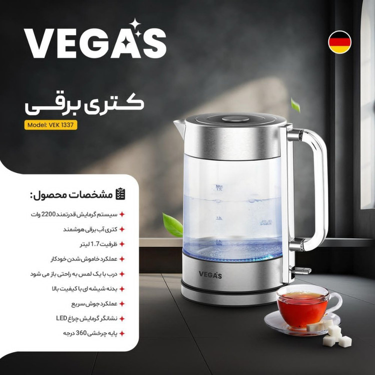 کتری برقی وگاس مدل 1337 با طراحی مدرن و بدنه استیل ضدزنگ، مناسب برای جوش سریع آب و تهیه چای، قهوه و انواع دمنوش. مجهز به سیستم ایمنی قطع خودکار.
