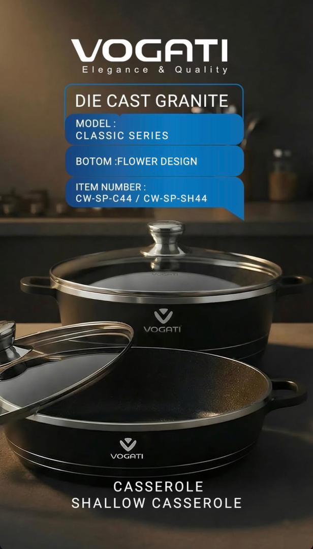 قابلمه کمعمق ووگاتی با طراحی مدرن و کیفیت ساخت بالا، گزینهای عالی برای پختوپز سالم و آسان است. بدنه مقاوم دایکست و پوشش ۵ لایه گرانیتی نچسب، مانع چسبیدن غذا شده و شستوشو را بسیار راحت میکند.