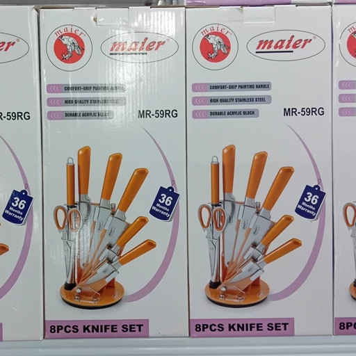 | اقلام موجود | چاقوی سرآشپز، چاقوی برش نان، چاقوی بزرگ، چاقوی کوچک، ساطور، قیچی، تیزکن، پایه نگهدارنده |